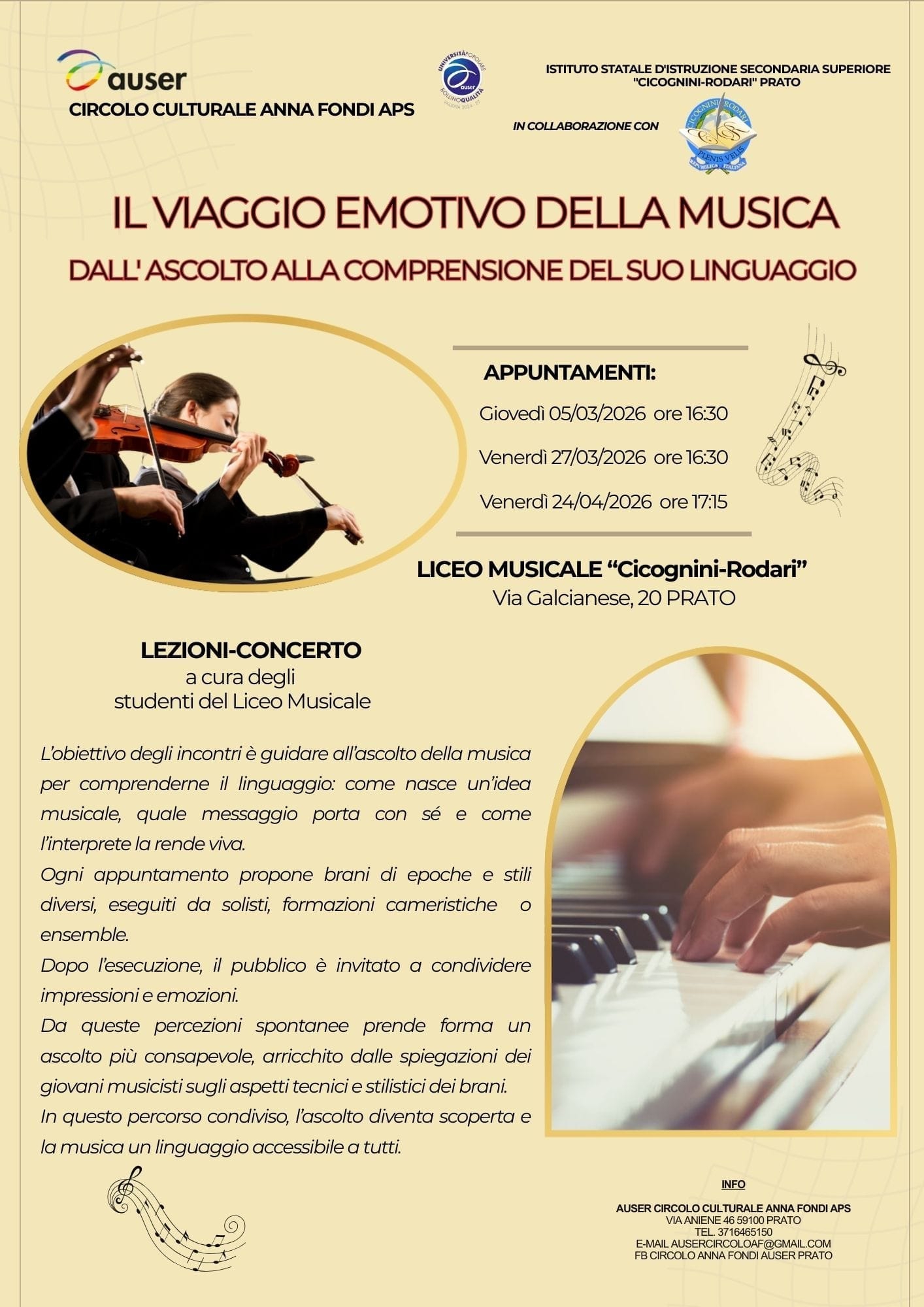 Due appuntamenti musicali (il prossimo sarà venerdì 24 aprile 2026, ore 17:15). Ogni lezione-concerto propone brani di epoche e stili diversi. Per un ascolto più consapevole, ogni concerto è arricchito dalle spiegazioni dei giovani musicisti sugli aspetti tecnici e stilistici dei brani.