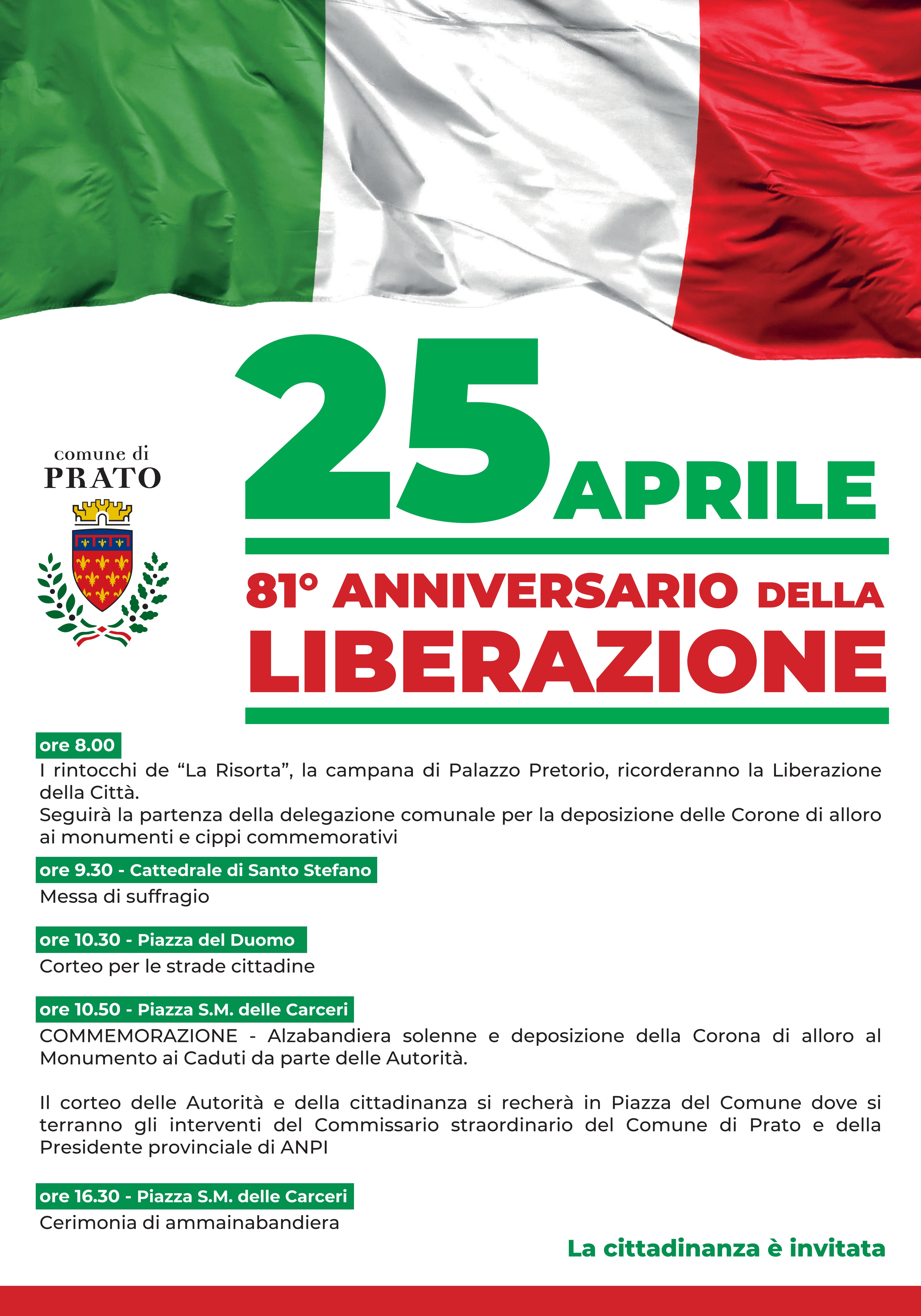 - a seguire il corteo delle Autorità e della cittadinanza ripartirà per Piazza del Comune, dove si terranno gli interventi del Commissario straordinario del Comune di Prato e della Presidente provinciale ANPI;